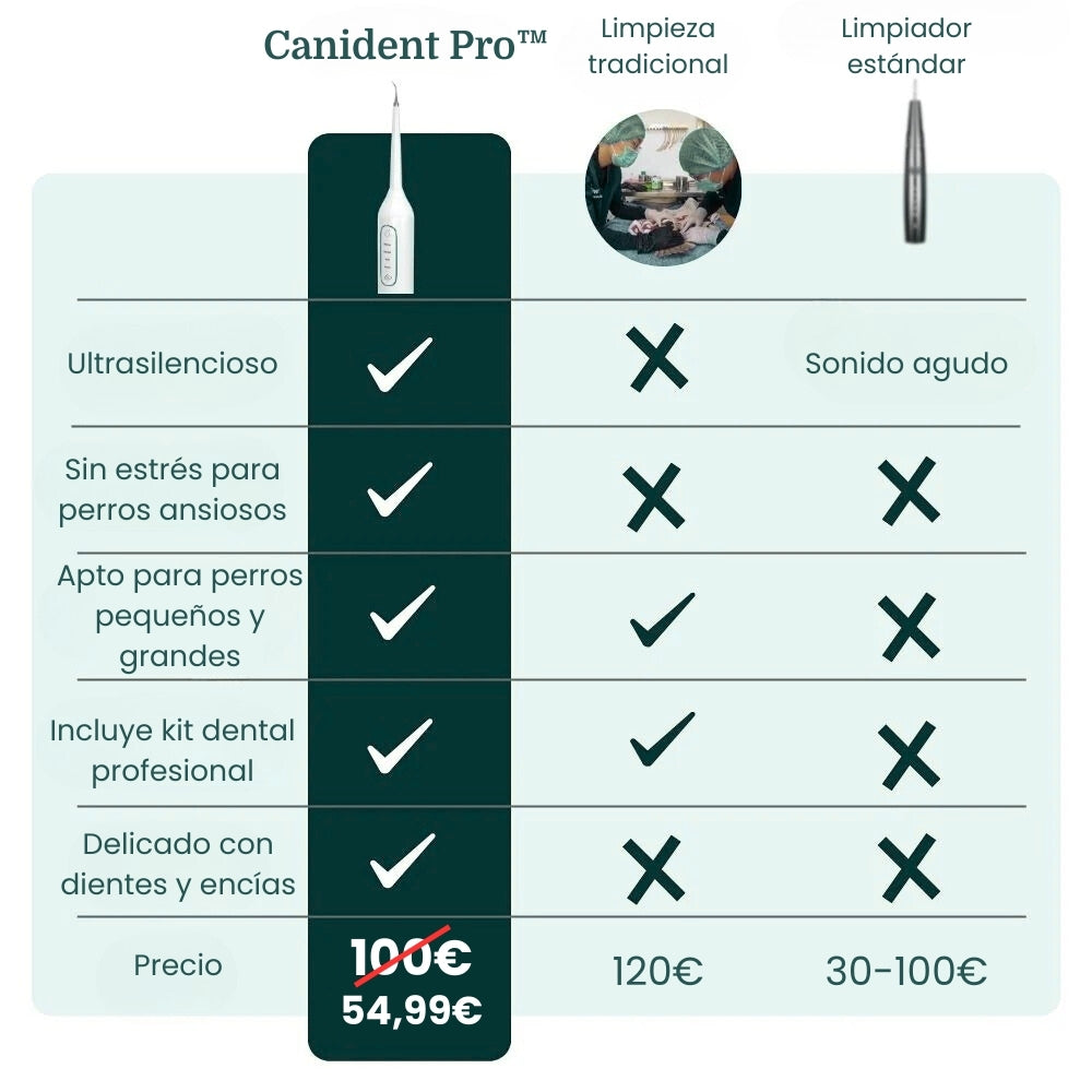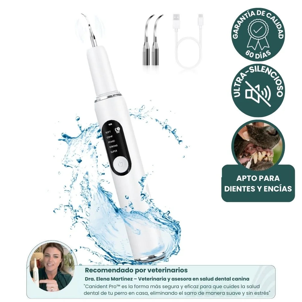Es el único dispositivo que combina vibraciones sónicas de alta frecuencia con chorro de agua integrado en una herramienta indolora, silenciosa y recomendada por veterinarios. Elimina el sarro sin raspado agresivo ni anestesia.